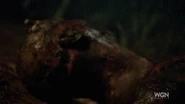 That night Dollie is at the home of the Barker's where she is participating in her bundling with their son Joe, while they are being watched by his parents. She begins to hallucinate she is being attacked by an unknown assailant and rips open the bundling bag before she flees angering Mrs. Barker. While back at the house of the seven gables, Mary again invades John's dream and once inside his head finds herself in the Alden house where she coerces him into showing her where the Malum is, the dream changes and they find themselves back at the graveyard where Mary continues to seduce him and realises that the Malum is buried in the grave of Giles Corey she wakes abruptly and informs Tituba of what she has discovered, who warns her to stay out of the captains head. Elsewhere Increase finally discovers he has been deceived by the captain, realising he is the witch, he uses his daggers and stabs the mans hands to the table and slits his throat after he finds the witches knot that has bound the wind delaying his travel to Salem, informing the sailors he is now in charge.