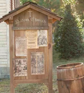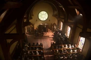 The focal point of Salem community, the church became the stage of the long and fervent sermons of Reverend Cotton Mather, who arrived in town to take care of a suspected possession phenomenon and that led to a hysterical witch hunt. The community meeting with the selectmen took place at Salem church, giving voices to a different opinion on proceeding with a real and systematic witch hunt, which will only bring problems according to Magistrate John Hale. Panic urged by zealous provocations of Cotton Mather, however, have caught on and even the arguments of veteran John Alden war manage to appease the masses. (The Vow)