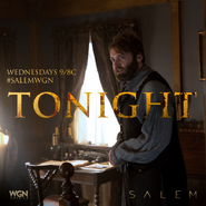 The episode opens with a heated scene involving Mary and Sebastian. At the House of the Seven Gables, Mary stormed out of a room (presumably Sebastian’s bedroom) and into a hallway. Sebastian followed her, asking for a kiss goodnight. In retortion, Mary spitefully told him that she hated him, to which he insisted that their implied sexual intercourse minutes prior was undeniably good, to which Mary shot back, telling him that that is precisely why she hated him before they kiss quite roughly. A passionate argument of sorts ensued, with them acting flirtatious towards one another throughout it. Sebastian pleaded Mary to run away with him to his family’s castle across the ocean (likely in Germany due to his mother’s German heritage), urging her to let Salem burn under the Dark Lord’s wrath. Mary insisted that even if she wanted to leave, she could not due to her earthly body being bound to the Salem area because of the resurrection spell. Not convinced, Sebastian told Mary that the Essex were lying to her about her not being able to leave Salem and tested it by grabbing her in a passionate kiss and teleporting the both of them to a wooded area in parts unknown, far away from Salem. Initially all seemed well, but within seconds, Mary began to shrivel and die, horrifying Sebastian, whom grabbed her once again, returning them to the House of the Seven Gables where an offended Mary angrily told him that he tested her word with her very life. Visibly ashamed and remorseful, Sebastian pleaded her for forgiveness. Keeping true to her act so as to secure his alliance, Mary told him that the only way that they could be together was if he helped her to murder the Dark Lord. A tearful Sebastian paused in contemplation.