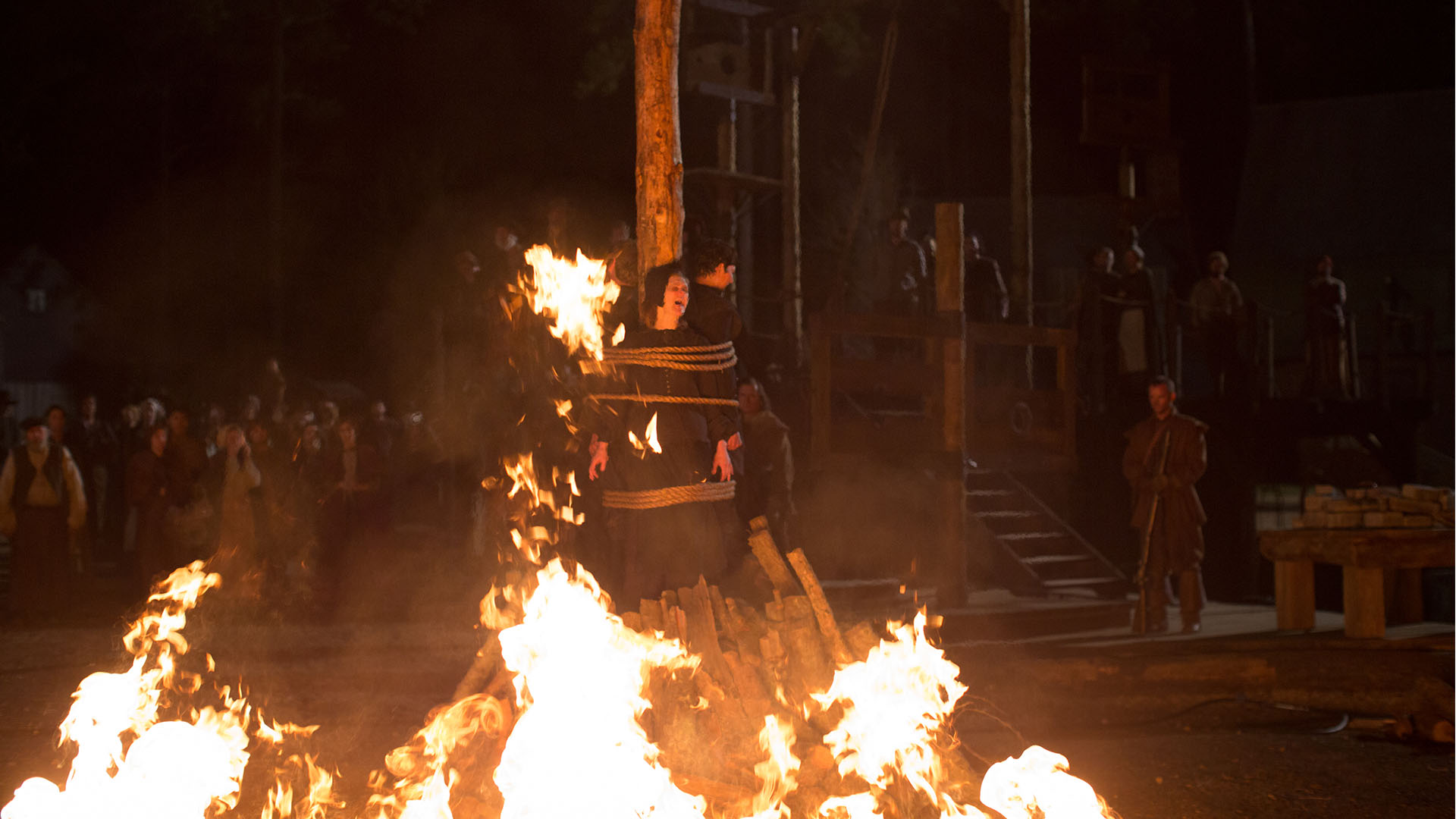 Deliberately causing death through the effects of combustion, or effects of exposure to extreme heat has a long history as a form of capital punishment. Many societies have employed it as an execution method for such crimes as treason, rebellious actions by slaves, heresy, witchcraft and demonstrated sexual deviancies, such as incest or homosexuality. The best-known type of executions of death by burning is when the condemned is bound to a large wooden stake. This is usually called Burning at the stake (or, in some cases, auto-da-fé during the Spanish Inquisition's trials). But other forms of death resulting from exposure to extreme heat are known, not only by exposure to flames or burning materials. For example, pouring substances, such as molten metal, onto a person (or down their throat or into their ears) are attested, as well as enclosing persons within, or attaching them to, metal contraptions subsequently heated. Immersion in a heated liquid as a form of execution is reviewed in death by boiling. Both the death by burning than the hot water torture have been used on the show. The Barker family was burned alive, while Mercy's acolytes were tortured with boiling water. Both on the order or directly executed by Increase Mather.
